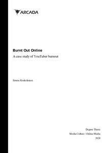 The subject area of this research is YouTuber burnout. This is a qualitative case study of five YouTubers in their twenties and thirties who have openly talked about mental health problems online. The primary research question is “What are the causes of YouTuber burnout?”. Qualitative research methods combined with the case study were applied to collect information. Analysis was conducted from interviews, vlogs and video essays of the cases being transparent about mental health problems, primarily burnout. The discourse was analysed to find common factors between the cases. The most common feelings, reasons and solutions of and for burnout were measured. Furthermore, the themes were put through the lens of clinical professionals to validate the cases experiences of burnout. The results show that all of the common themes found amongst the cases correlate to burnout predictors noted by psychologists. The results of earlier research differed in the aspect of economics. YouTubers most often work from home, so the days get longer. The passion for their job and feeling of accountability towards their viewers tends to result in the feeling of too much pressure, which feeds the burnout. The findings suggest that emotional issues rise to the surface when all the basic needs in life are taken care of and there is seemingly nothing to worry about. The creators often do not understand why they feel miserable. Partly, since burnout is generally thought to happen amongst doctors, nurses, teachers, social workers, police officers and the like. But more so, because they do not have enough knowledge on the subject.